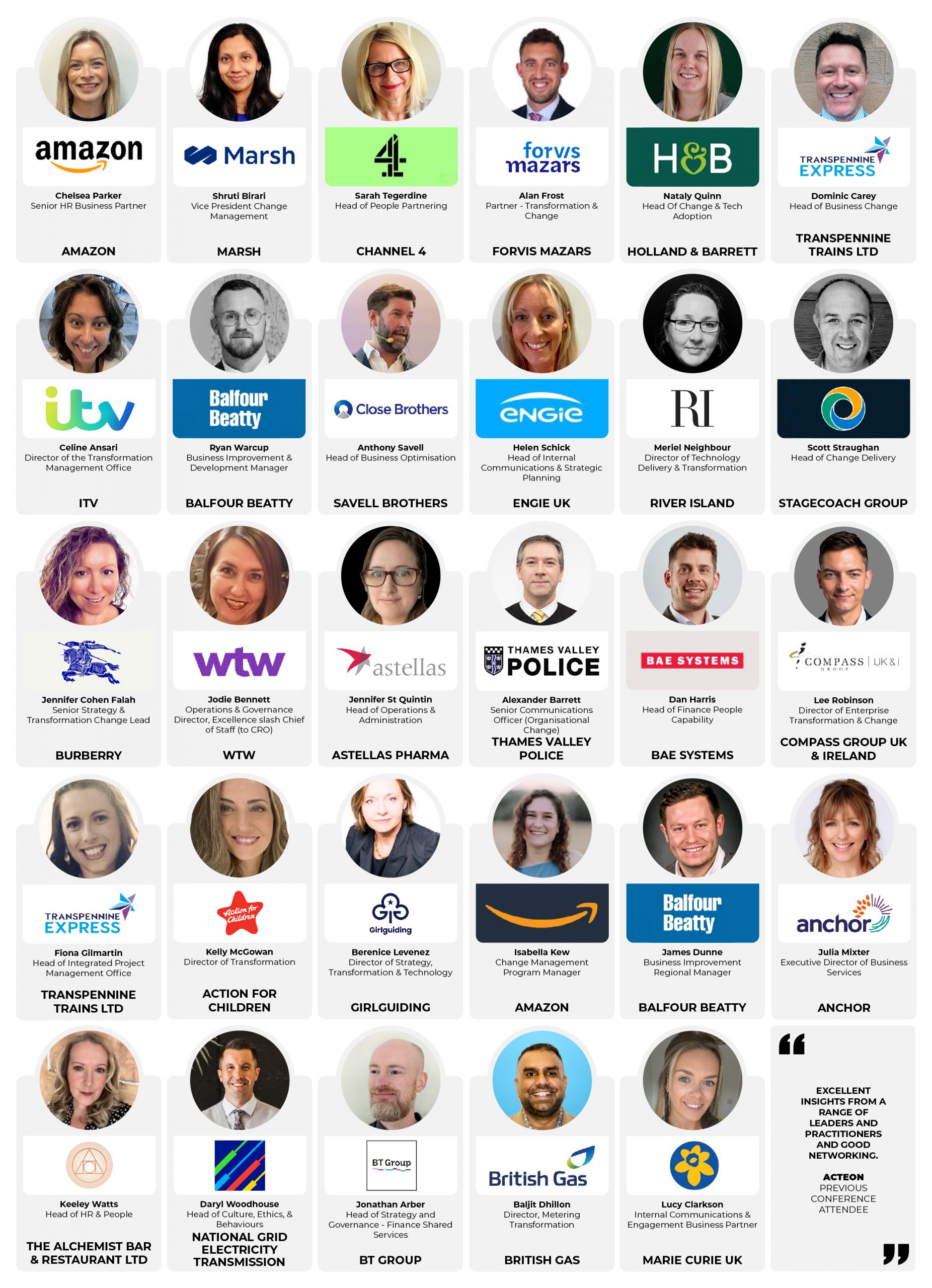 30+ Inspirational, Cross-Sector People Leaders & Change Experts: AI Adoption In Change ■ Embedding Change Into Company Culture ■ Clear & Cohesive Change Comms ■ People Centricity & Employee Wellbeing ■ Engaging Senior Leadership ■ Optimised Change Journey Management ■ Key Measurements & Metrics ■ Upskilling & Engaging Employees ■ The Future Of Change